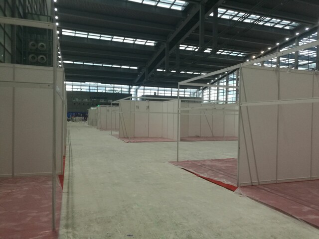 此次展位搭建物料:600米桁架背景  236個鋁料標準展位 地毯 燈光 舞臺 桌椅等等。